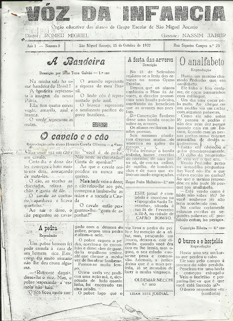 BLOG DESTINADO AO RESGATE DE HISTÓRIAS E DE FATOS SOBRE A VIDA E O DESENROLAR DOS TEMPOS NO MUNICÍPIO DE SÃO MIGUEL ARCANJO/SP/BRASIL. SOCIEDADE. GENTE. COSTUMES. POLÍTICA. CULTURA. FOLCLORE. " SE QUERES PREVER O FUTURO, ESTUDA O PASSADO"- CONFÚCIO. " POVO QUE NÃO TEM MEMÓRIA É CONDENADO A REPETIR A HISTÓRIA"- SANTAYANA. PESQUISAS: LUIZA VÁLIO. RESPONSÁVEL: LUIZA VÁLIO.